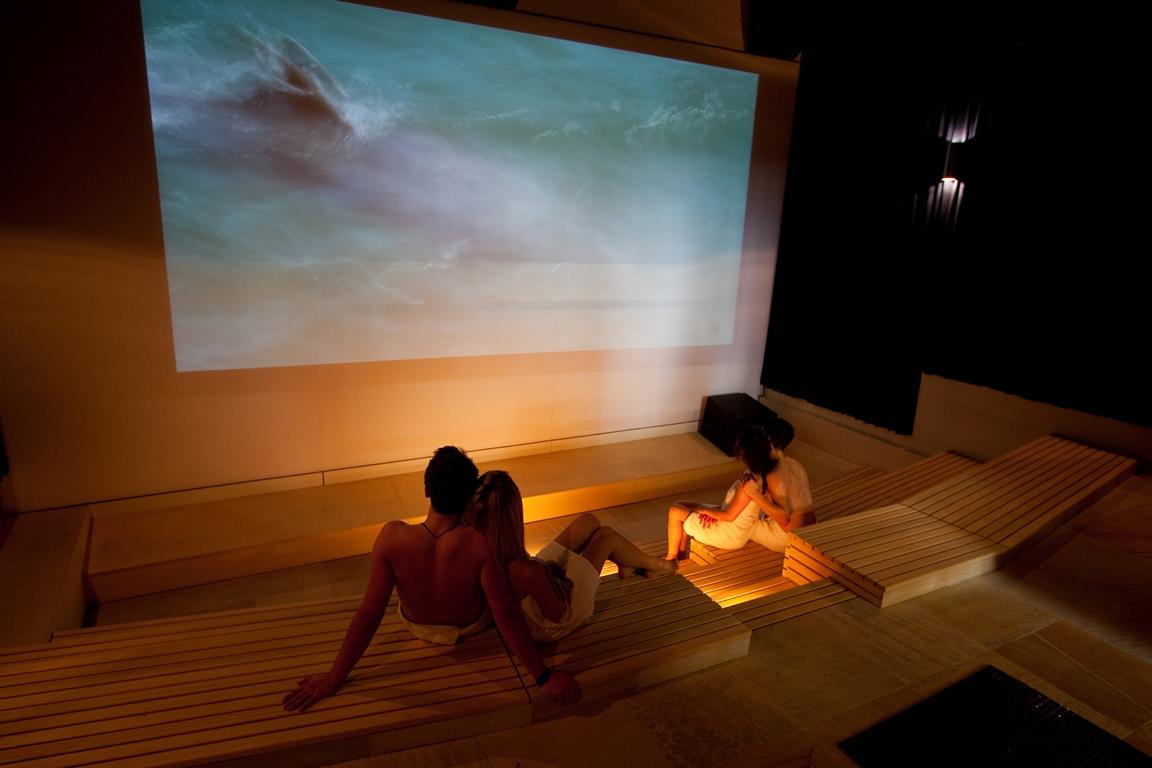 Wie üblich, starten wir sanft in unseren heutigen Schwitz- und Wellnesstag und entscheiden uns für die Kino-Sauna. Normalerweise sind wir wenig von solchen ausgefallenen Ideen begeistert Haben wir doch schon Saunen gesehen, in denen beispielsweise Fußballspiele übertragen werden, was unserem Geschmack nicht wirklich entspricht. Jedoch werden wir positiv überrascht, denn wir betreten tatsächlich ein Kino! Die Bänke sind tribünenartig angeordnet und Vorhänge an den seitlichen Wänden sowie neben der Leinwand erstaunen uns hier. Statt der sonst üblichen Kopfstützen aus Holz liegen hier bequeme Kissen und die Bänke sind besonders breit. Gezeigt werden hier nur Naturfilme und Dokumentationen über das Tier- und Pflanzenreich unserer Erde. Ein Programm vor der Sauna informiert die Gäste über Startzeit und Titel des jeweiligen Filmes. Schnell vergisst man hier die Zeit, was jedoch auf Grund der recht niedrigen Temperatur in der Kino-Sauna nicht weiter tragisch ist.