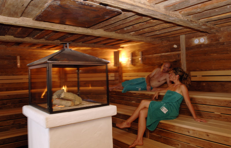 Erdsauna - Die im Außenbereich gelegene Massivholzsauna ist dank Kamin sehr stimmungsvoll. Vom Erdreich umfasst verspricht diese Sauna ein besonders mildes Klima, hier finden stündlich Aufgüsse statt, Temperatur bis zu 95°C bei circa drei Prozent Luftfeuchtigkeit.