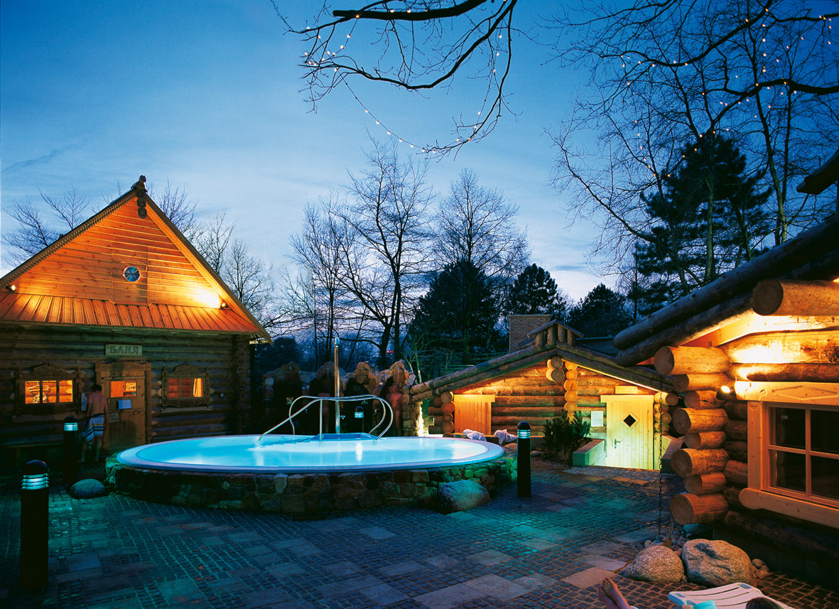 Im Außenbereich, der durch eine Treppe abwärts erreichbar ist, erweitert sich das große Angebot durch ein Banja, eine Kelo-Sauna mit Kaminzimmer, eine Erdwall-Sauna mit bis zu 100 Grad und einen Ruheraum.