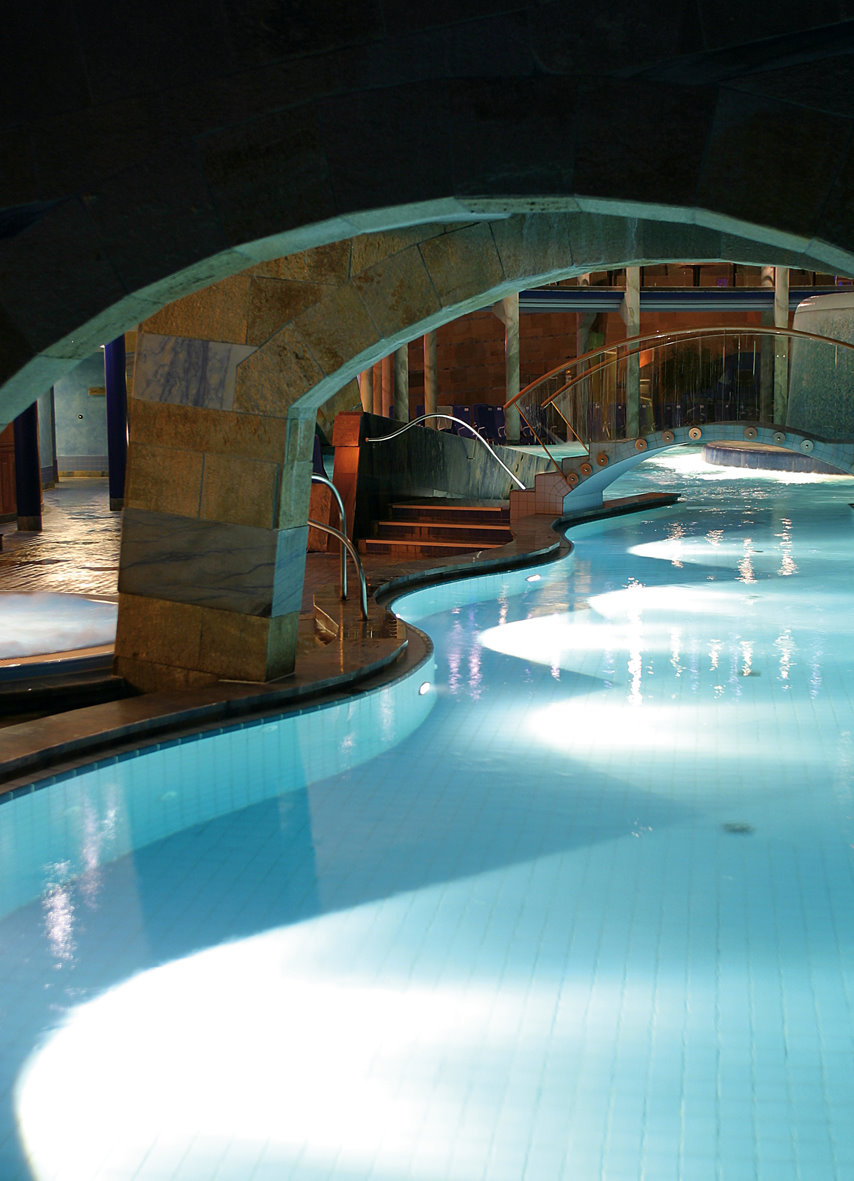 Gespannt betreten wir den Badebereich, in den wir von den Duschen aus direkt gelangen. Ein sehr angenehmes Ambiente erwartet uns. Das Bad ist gut besucht, wirkt aber überhaupt nicht überfüllt. Wir haben keine Badesachen dabei, trotzdem machen wir neugierig eine Runde durch die Badehalle. Unterwegs sehen wir einen Whirlpool, ein Dampfbad, eine Heiß-Kalt-Grotte, einen Trinkbrunnen, ein Kneippbecken, ein Sitzbecken, ein Therapiebecken mit Unterwassermusik und einen Strömungskanal, der im Außenbereich liegt. Alles wirkt sehr schön, sauber und entspannend. Man fühlt sich sofort wohl.