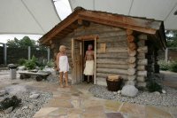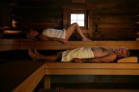 Kelosauna - Das rustikale Blockhaus aus bis zu 500 Jahre alten, finnischen Kiefernhölzern liegt im Saunagarten und beherbergt eine finnische Blocksauna. Die hohe Raumtemperatur von circa 85 bis 90° C sowie regelmäßige Aufgüsse sprechen in uriger Atmosphäre geübte Saunagäste an.Der Sauna-Innenbereich: