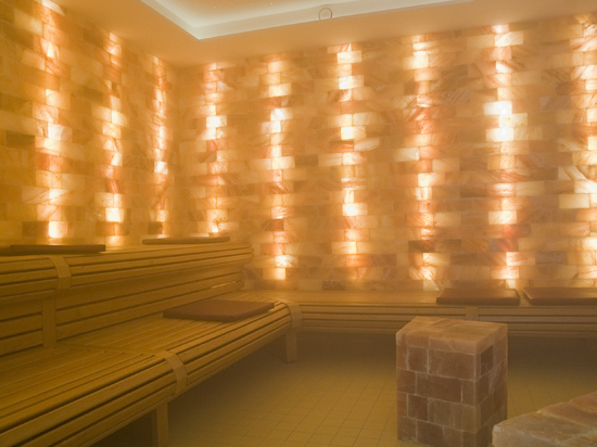 Im Innenbereich schauen wir uns den Salzraum einmal genauer an. Hier befinden sich Bänke mit Auflagen an den Wänden und kleine Tische aus Salzkristallen. Es herrscht angenehme Ruhe. Einige Gäste schlafen entspannt auf den Bänken und andere lesen Zeitung. Eine Salzkristallwand schafft durch sanfte Beleuchtung eine schöne Atmosphäre. Aus Düsen wird kontinuierlich ein 5%iger Solenebel in den Raum geleitet. Dieser wirkt sich gesund auf den Organismus aus. Gäste, die unter Bronchienproblemen oder unter Schuppenflechte leiden, finden hier Linderung. Empfohlen wird eine Aufenthaltsdauer von 30 Minuten. Diese Zeit wirkt auf den Körper wie ein 2tägiger Aufenthalt am Meer. Das lassen wir uns mitten im bergischen Wuppertal natürlich nicht entgehen.