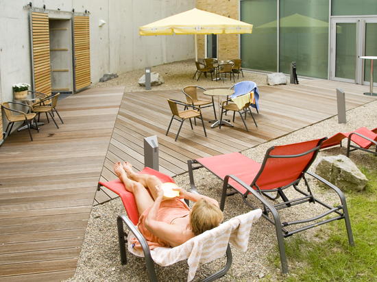 Abgekühlt schauen wir uns im Saunagarten um. Im Sommer stehen reichlich Liegen zum Sonnen bereit. Einen überdachten Raucherbereich gibt es hier ebenfalls. Außerdem finden wir dort einen überdachten Duschbereich und eine finnische Trockensauna mit einer Temperatur mit bis zu 100 Grad.