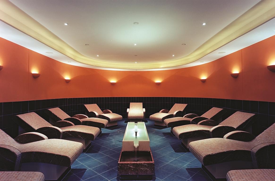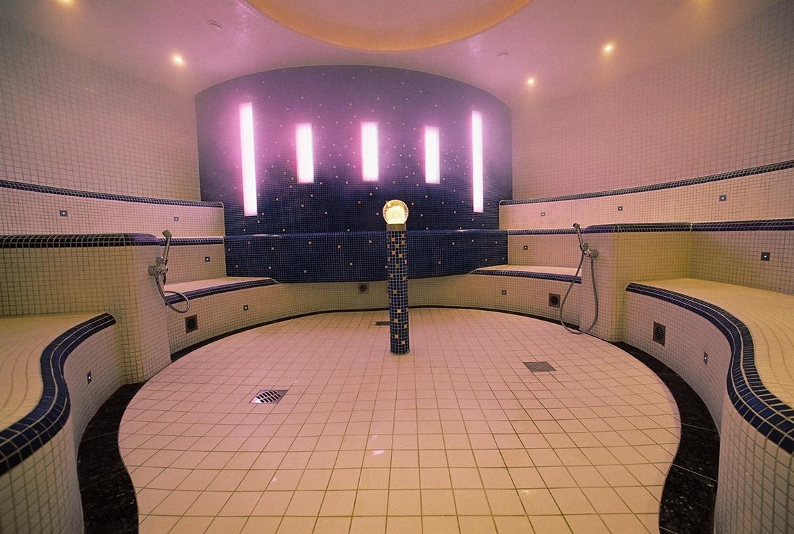 Zuerst besuchen wir die Kristallsauna. Mit 70° C, Farblichtwechsel und einem wunderschönen Kristall über dem Saunaofen lässt es sich hier gut aushalten. Die Sauna ist etwas kleiner, sehr sauber und gemütlich. Entspannt legen wir uns zurück und genießen unser erstes Schwitzvergnügen des Tages. Wir erfrischen uns in einer der Erlebnisduschen im Obergeschoss, die sich direkt gegenüber von der Kristallsauna befinden. Ein angenehmer Sprühnebel riesel auf uns nieder. Ein sehr angenehmes Erlebnis. Abgekühlt spazieren wir auf die Außenterrasse und genießen die frische Luft. Im Dampfbad findet nun eine Peelinganwendung statt. Ein wohlriechender Dampfnebel begrüßt uns hier. Dieser wurde mit einem Minzaroma angereichert. Das Dampfbad ist in verschiedenen Blautönen gehalten und rund angelegt. Mosaik-steinchen an den Wänden schimmern im Dampf. In der Mitte befindet sich eine Brunnensäule. Auf drei verschiedenen Ebenen kann hier geschwitzt werden, so findet jeder Gast die für ihn am besten geeignete Intensität. Der Saunameister betritt das Dampfbad und verteilt 2 große Kellen Salz, welches mit Massage-Öl angereichert wurde, an jeden Saunagast. Dieses Salz wird auf dem Körper verteilt und sanft einmassiert. (Achtung: Gesicht sowie rasierte Körperstellen auslassen!). Die Salzkörner wirken wie ein Peeling. Das zugesetzte Massage-Öl pflegt und dringt durch die geöffneten Poren tief in die Haut ein. Das tut gut!