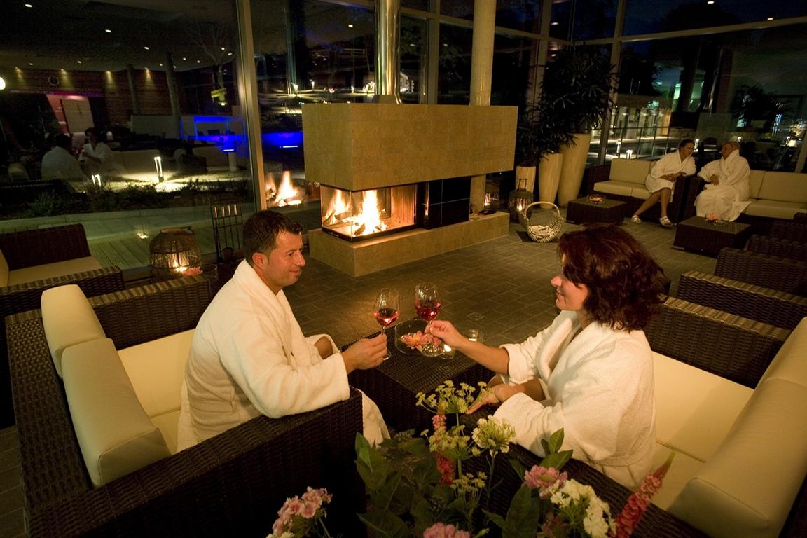 In der Duschgrotte neben der Aufguss-Sauna erfrischen wir uns mit dem kühlen Nass. An der frischen Luft wird es uns jedoch schnell kalt, und wir spazieren zurück ins Warme. Der schöne Gastronomiebereich am Kamin wirkt jetzt, bei Einbrechen der Dunkelheit, noch gemütlicher. Wir finden ein Plätzchen vorm Kamin auf den bequemen Möbeln und 2 warme Decken dazu. Eine Tafel mit einem Angebot macht uns neugierig: "Granat-Secco mit Johannisbeeren". Das möchten wir uns natürlich nicht entgehen lassen und bestellen 2 Gläser bei einer der netten Angestellten. Das perlende Getränk schmeckt sehr lecker und exotisch. Johannisbeeren befinden sich auf dem Boden des Glases und lassen sich mit etwas Geschick ebenfalls genießen. Eine tolle, außergewöhnliche Idee, und für diese sind wir von saunatester.de ja bekanntlich immer zu haben.